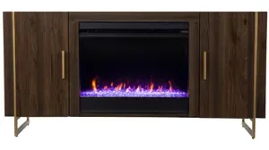 Modernize your fireplace console experience with this low-profile Everly fireplace console. A spacious mantel easily displays d_cor items or your flat screen TV, while two cabinets neatly tuck away movies and spare cords. Color changing flames reflect off faux crystals to give your living room or den a cozy feel, working with or without the heater for enjoyment in any season. Give your home a stylish upgrade with this fireplace console media stand.