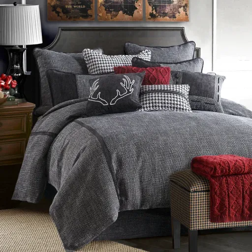 Elevate your bedroom with the Hamilton Bedding Set from RC Willey. This gray tweed comforter offers an upscale farmhouse charm, but could easily be paired with many other aesthetics. The black accents draw the eye and give a modern feel to this luxurious bedding collection. This 4-piece set includes (1) comforter, (1) bedskirt, and (2) pillow shams.