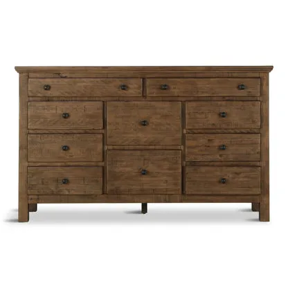 The Valier Bedroom Collection features a light brown, sandalwood finish and is handcrafted with solid pine showcasing the distressed wood. Dark bronze hardware accents this collection perfectly.