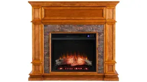 Southwest style and sleek sophistication convene at the crossroads of this Boylan media fireplace. Realistic faux black river stone juxtaposes handsomely with clean woodwork and the sienna finish. This electric fireplace saves energy with long-lasting, cost-effective LED bulbs, while igniting ambience with realistic flames and supplemental heat. A recessed-door shelf hides the clutter of media accessories for a traditional look with modern conveniences. Warm up your living space with this mission style piece-a must for any home. <strong>Do not place TV on Mantel.</strong>