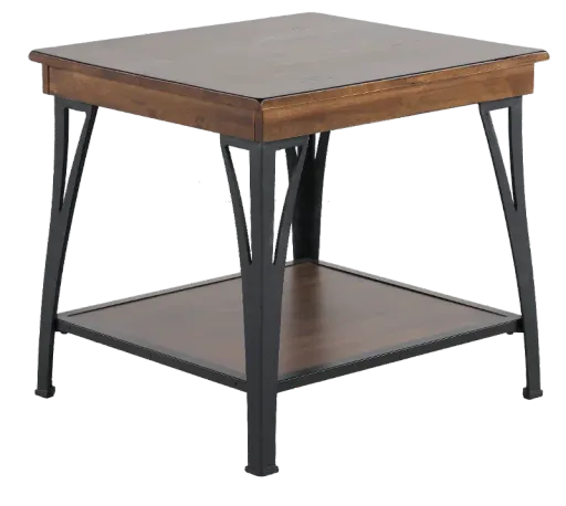 Made from Birch and black metal, this contemporary end table mixes materials flawlessly. The rich copper stained wood highlights the natural grain, contrasting with the unique metal detailing of the frame and table legs. This piece would go perfectly in your living room with a cream colored lamp, or stands strong on its own to keep your items close by.