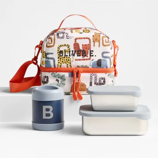 We've simplified back-to-school shopping with a lunchtime bundle that earns straight As for both sturdiness and style. Created with the input of hundreds of parents, our insulated lunch box is made of extra-sturdy polyester (that includes recycled plastic bottles) and is sized just right, with dividers and pockets to keep snacks in place. A stainless-steel water bottle with a pop-up straw is designed to provide easy hydration, while stainless-steel food containers with leak-proof silicone lids help you divide and conquer meal prep. Our lively Geo Jungle print and cool pops of blue will have kids delighted to dig into lunch (yes, even the carrot sticks).