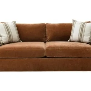 Upholstered in a cognac velour fabric, this sofa features reversible back and seat cushions, padded arms, two coordinating toss pillows, and a tailored base.