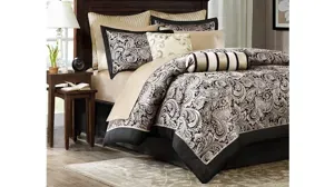 If classic is your style, Aubrey Queen 12 Pc. Bed Set is perfect for you. Inspired from an updated paisley motif and is woven into a beautiful combination of deep black, gold and a hint of platinum for a touch of sheen to your bedding. The comforter and shams offer beautiful details with a 2" flange and 1/2" flat piping in a soft gold. The reverse of the comforter is a rich taupe color. The sheets are 100% cotton, 200 thread count, and the light khaki coordinates back perfectly to the bedding collection.