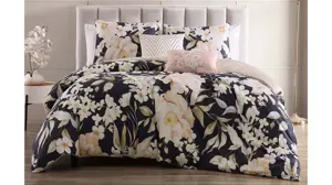 Bebejan Blossom Haven 5-pc. Reversible Comforter Set is soft blush camellia flowers intermixed with lovely groupings of cream blossoms sit atop a rich navy-grey background. The comfy 100% cotton sateen comforter set also includes 2 shams, 1- 18x18 tufted embroidery pillow and 1- 12x18 printed pillow. This comforter also has great versatility as it reverses to a tan tonal leaf print for a change of pace in your bedroom.