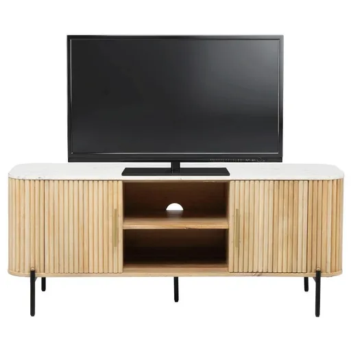 The Karlen TV Stand is the perfect choice to make your entertainment center the "center" of the room. Featuring a ceramic top and marble-style design, this gorgeous stand offers two soft-closing doors with three fixed shelves. Featuring a two-tone combination and distressed finish, this piece is sure to make quite the impression in your home.