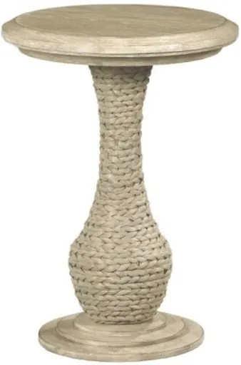 Vista is a casual transitional collection, utilizing everyday transitional styling and incorporating it with some seemingly casual elements and accent pieces. Round end table with a woven seagrass pedestal and wooden base adds a different element to the group.
