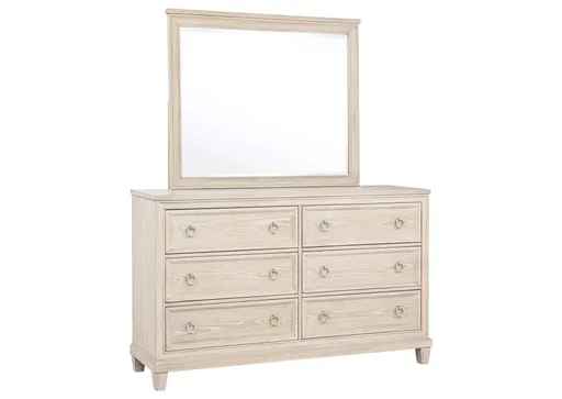 Breezy and balanced, this dresser and mirror set captures the warmth of coastal mornings and the elegance of timeless design. Framed with stepped trim and polished nickel ring pulls, the six-drawer dresser offers generous storage wrapped in washed oak serenity. Above, the mirror reflects light and openness, framed to echo the dressers graceful form. Crafted from poplar, oak veneer, and engineered wood, this set brings gentle refinement to the heart of the bedroom.