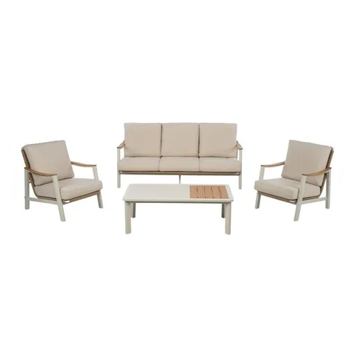Enjoy the great outdoors in style with the Leisure 4-Piece Patio Set. Made with water resistant olefin fabric cushions and rust-proof aluminum frames, each piece in this set is specially made to stand up to the elements. With a planked style table top and flared legs, this table and chairs is sure to make entertaining fun, whether you use it indoors or outdoors.