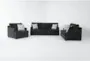 Enhance your living room with the Colby Smoke Grey Fabric 3 Piece Sofa Loveseat & Arm Chair Set. This casual set features a sofa, loveseat, and armchair, all upholstered in Madigan Smoke fabric. The loose, reversible back cushions provide added comfort and versatility.