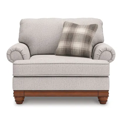 Fresh yet classic. That’s the beauty of this oversized chair. Dressy and also soft to the touch, its organic neutral-toned upholstery is sure to bring a transitional farmhouse aesthetic to your living space. An accent pillow in windowpane plaid infuses a cozy and inviting farmhouse sensibility, while a full wraparound base and decorative turned legs complete the chair's timeless look. It's the perfect place to curl up after a long day.