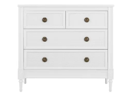 The Madeline 4 Drawer Dresser with Changing Top and Interlocking Drawers by Delta Children is an elegant and functional addition to the nursery, kids’ bedroom, even your master bedroom. The timelessness of this dresser is found in the details—the woven cane detailing on the drawer fronts, rosette carvings, fluted legs and antique brass drawer pulls elevate any bedroom. It features four spacious drawers for ample clothing storage and includes a removable changing top that creates the perfect space for diaper changing. Remove the changing top to create a more grown-up space later on. For your child’s safety, this dresser is outfitted with an interlocking drawer system that limits the number of drawers that can be opened at one time.