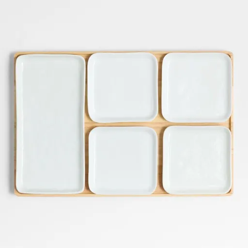 Entice your guests with appetizers, pastries and other delicacies served on a modern mix of porcelain and hardwood. Striking in its simplicity, this versatile dip set combines two entertaining essentials—our Merge large wood tray and our Mercer appetizer plates—in countless combinations. The contemporary white porcelain Mercer square and rectangular plates take on organic overtones with freeform rims and finely "hammered" surfaces that ripple the light. Meanwhile, the natural hardwood Merge large serving tray is striking in its simplicity. Corral five plates piled high with appetizers on the subtly lipped tray for a neat, gridded look. Or serve cheeses on the tray and use the plates to hold a variety of crackers and fruits. Mix and match for the ideal appetizer presentation.