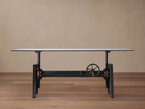 A masterpiece of modern design, the base of our Industrial Crank Desk is cast from solid iron and features a functioning wheel-and-gear mechanism. A versatile desktop, crafted from tempered glass, can be adjusted to create the perfect surface for any setting.