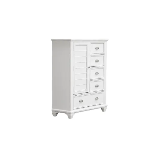 The Jamestown Door Chest in White is a perfect combination of durability, style, and practicality, designed to enhance any bedroom. Expertly crafted from solid Acacia, premium manufactured woods, and authentic Oak veneers, this door chest is built to last while preserving the natural elegance of real wood. The Jamestown collection brings modern coastal charm to your space, with clean, contemporary lines and a crisp, brushed white finish that brightens your room and evokes a serene, beach-inspired ambiance. Offering generous storage, the door chest is thoughtfully designed with clean lines and elegant panel detailing, blending practicality with sophisticated style to keep your bedroom tidy and clutter-free. The drawers glide effortlessly on robust full-extension glides, with meticulous dovetail joinery ensuring smooth operation and enduring quality. Additional thoughtful details include finished drawer interiors to prevent snags and a top drawer lined with soft velvet, providing extra protection for your most treasured items. This door chest is a chic and functional piece that brings both elegance and organization to any bedroom.