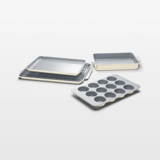 You'll be smitten with this beautifully designed bakeware set that's as amazing to look at as it is to use. Featuring minimalist designs, cream-colored exteriors and a non-stick ceramic finish, these pans are a joy to cook with. The set—medium and large sheet pans, muffin tin and rectangular pan—is versatile enough to take on any recipe and makes a fabulous wedding, graduation or housewarming gift. To keep things orderly inside kitchen cabinets, the five-piece set includes an organizer that corrals all of the components.