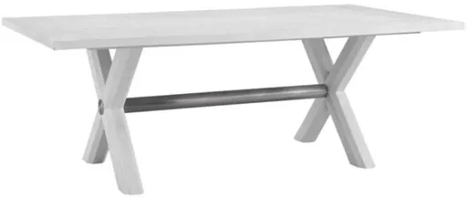 The Nadine Dining Table features a coastal contemporary inspired design and is constructed with solid wood and veneers in a bright white oak finish. The table base features a heavy octagonal shaped X-base and a brushed nickel finished metal cross-bar.