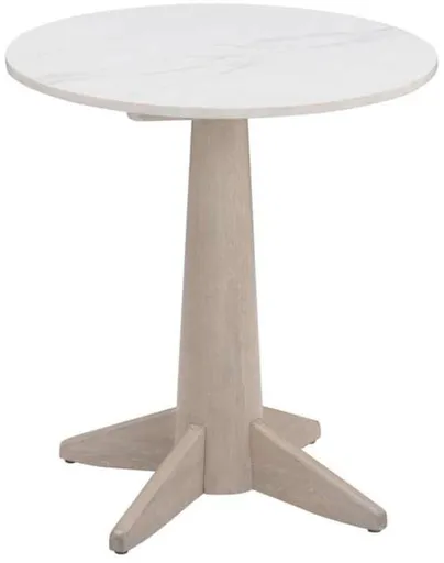 The Horizons end table epitomizes modern coastal elegance, blending natural materials seamlessly. Its round single-pedestal style features a pristine white marble top, exuding timeless sophistication. Crafted with a solid wood base in a neutral white oak finish, it strikes the perfect balance between functionality and style.