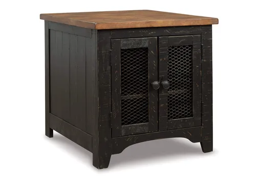 To those with an eye for the best in rustic farmhouse living, the two-tone Valebeck end table doubles up on charm. Designer touches include plank-effect styling, distress marks and wire mesh door fronts for added character.