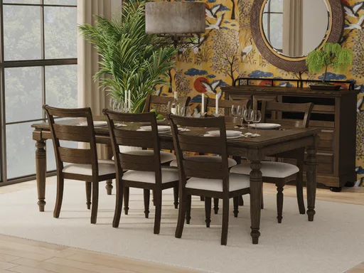 The Bella Dining Set combines timeless style, everyday functionality, and exceptional value for a complete dining room upgrade. Crafted from brown elm solids and veneers with a warm coffee finish, this set includes the elegant Bella Dining Table and six Bella Side Chairs. The table features a classic standard-height design and a convenient 18-inch removable leaf, making it easy to expand for family gatherings or dinner parties. Its rich finish and clean lines offer a versatile look that complements rustic, transitional, and traditional décor.