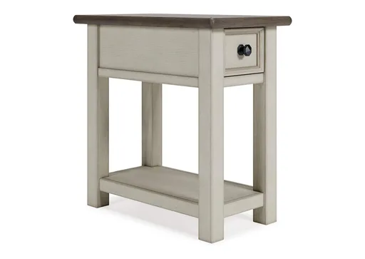 Whether your style is farmhouse fresh, shabby chic or country cottage, you’ll find the Bolanburg chairside end table dressed to impress. Its two-tone finish pairs weathered oak with antique white for that much more quaint character. Charming elements include a plank-and-frame style top, black faceted hardware and a smooth-gliding drawer for remote controls and more. Integrated power supply with dual USB charging ports is ideal for keeping your personal devices at the ready.