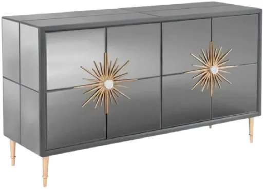 Stunning in Black!! Create dramatic high-style with the incredible Rivoli Server that features beveled black mirror panels with black wood edging, Art Deco inspired custom starburst hardware, and turned, gold-leaf legs. The interior is finished in black and offers two adjustable shelves.