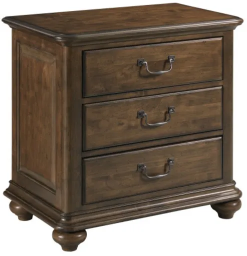 The Kincaid® Commonwealth Witham Brown Nightstand offers classic design and modern convenience. Finished in a rich brown tone, it features three drawers for organized storage, a built-in night light, and an electric outlet at the back. Thoughtfully crafted, it blends timeless style with practical functionality for your bedside.