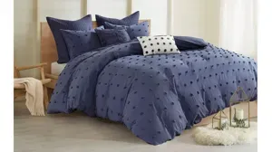 The Brooklyn Cotton twin/twin XL 5-piece comforter set brings a soft and charming update to your bedroom. The indigo blue cotton comforter features small tufted chenille dots that create a fresh shabby chic look. Matching sham and quilted Euro sham complement the cotton jacquard comforter set. Two Decorative pillows are also included, adding the finishing touches. This bedding set is also OEKO-TEX certified, meaning it does not contain any harmful substances or chemicals to ensure quality comfort and wellness.
