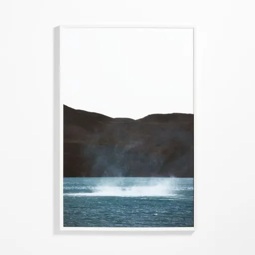 Photographer Addison Jones captured this mysterious image while on a hike in Patagonia. Against the backdrop of silhouetted hills, a white sky and otherwise placid blue lake, the cloud-like mist caused by a sudden windstorm takes on a surreal aspect that brings intrigue and natural beauty to your walls. This striking photograph is presented under clear acrylic in a matte white frame.