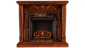 A beautiful Victorian design and faux marble combine to create this timeless design; add the beauty and romance of a glowing fire and you have the versatile Craig Fireplace that will complement any room in your home. This walnut finish fireplace features traditional pilaster wood corbels, an intricate center medallion, and luxurious faux marble. The firebox has realistic, multicolor flickering flames and glowing embers withan interior brick design for a more lifelike look. This transitional fireplace is great for the living room and bedroom, and even adds a warm touch to the dining room or home office. This electric fireplace features energy efficient LED and requires no professional installation, making it a cost effective way to upgrade your living or media room. Easy to use remote control offers 4-way adjustability to warmthe room conveniently. Safety features include automatic shutoff and glass that remains cool to the touch. Turn off the heat to enjoy the fireplace ambience year round.