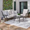 The Turin Collection features a distinctive style in a reddish-brown color frame that creates a clean and inviting presence in your outdoor patio space. Each piece in this Turin 3 Pc. sofa group is made with an extruded aluminum frame with cast aluminum accents and features a hand-applied antique finish, bringing out the detail in the frame. The mid-modern design of the sofa and club chair feature hammer-forged style arms and a nailhead windowpane back, giving a unique flair to your outdoor space. The coffee table top is skillfully designed with an ornate lattice pattern. The Charlotte Sparrow Sunbrella® cushions possess a unique texture with flecks of brown and grey within a cream ground and contrasting rope braided welt. Settle into ultra-plush cushions set upon sling suspension for extra comfort.