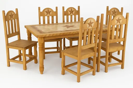 Marble Star Rustic Dining Room Set The Marble Star Rustic Dining Set brings the heart of Texas craftsmanship into your home with its solid pine construction and distinctive Texas Star inlay design. The centerpiece table showcases a hand-laid tumbled marble top framed in natural wood, creating a perfect blend of rustic warmth and southwestern elegance. Six matching chairs feature carved Texas Star accents on the backrests, offering both sturdy comfort and timeless charm. Whether in a ranch-sty