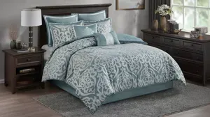 Add a touch of class to your bedroom with the Odette 8-pc. Comforter Set. The luxurious textured jacquard comforter and shams flaunt a gorgeous damask medallion design with silver striations on the satin ground that add dimension to the lavish look. A solid aqua reverse and stunning euro shams complement the top of the bed to complete the ensemble. Also included are two decorative pillows that feature embroidery and cording details, while a solid aqua bed skirt provides a clean and elegant finish. Overfilled for superior warmth and comfort, this jacquard comforter set offers a strikingly luxurious update to your decor. Items in the set may come in a rolled or compressed packaging, which will need to be fluffed up or steam ironed before use to remove wrinkles.
