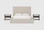 The Porto California King Upholstered Storage 3 Piece Bedroom Set with 2 Voyage Brown 1 Drawer Nightstands by Nate Berkus + Jeremiah Brent brings modern sophistication to your bedroom. This California King set features a platform bed with convenient footboard storage, perfect for keeping your space organized. The blend of polyester, viscose, and linen fabric ensures a comfortable and durable experience.