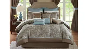 Update your entire room at one time with the Brystol 24-pc. Room in a bag. This intricate paisley design features dusty shades of blue and taupe on a chocolate base for a warm look in your space. Four decorative pillows use embroidery and fabrication to create the perfect finishing touches to the top of bed. Four window panels in corresponding brown create the perfect balance for the two valances in matching bedding fabric. Four tie backs, two euro shams and a bedskirt use the dusty blue to coordinate all these items into one cohesive look.
