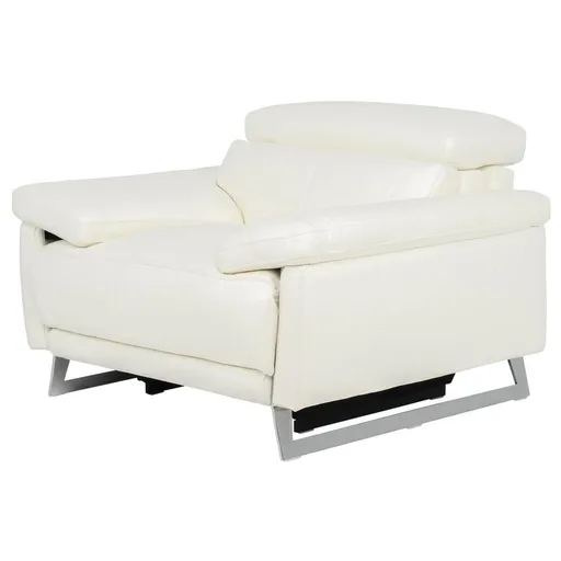 The Gabriel White Power Recliner is all things stylish and chic. Made with 100 percent top grain leather where the body touches, this beautiful chair features angled chrome legs, baseball contrast stitching, and a lovely modern style. Offering power motion in the headrest and footrest, this chair brings the comfort, keeping you cozy for hours.