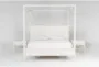 Transform your bedroom into a serene retreat with the Austen White California King Wood Platform Canopy 3 Piece Bedroom Set. This traditional set includes a stunning canopy bed and two 1-drawer nightstands, all crafted from oak veneer and solid rubberwood for lasting durability. The white finish adds a touch of softness, creating a tranquil ambiance perfect for relaxation and rest.