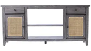 Raegan Media Console is a modern farmhouse design with this two-tone media stand. Spacious cabinets neatly tuck away movies, games, and blankets, while two drawers store remotes and gaming accessories. Natural rattan accents complement the light gray finish, adding a rustic feel to your home d_cor. Create a relaxing space to host the big game or binge your favorite shows with this entertainment center in your living area or game room.
