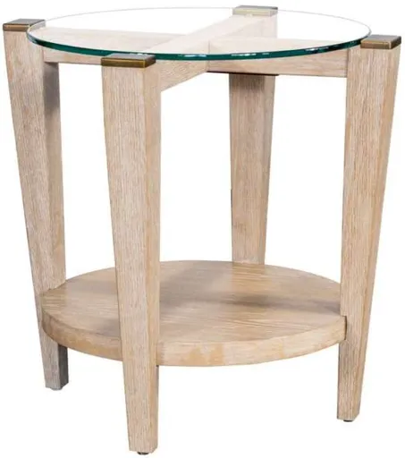 The Dunes end table effortlessly blends coastal charm with modern elegance, making it a versatile addition to any living space. Its clean lines and wire-brushed wood frame finished in bleached oak exude a sense of beachside tranquility. The lay-on glass tops, nestled within the frame and adorned with antique brass-finished post caps.