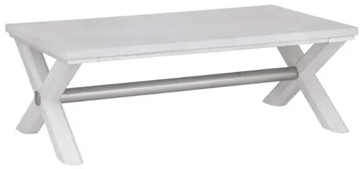 The Nadine Cocktail Table boasts a coastal contemporary design, crafted with solid wood and veneers in a bright white oak finish. Its sturdy base showcases a heavy octagonal-shaped X-base with a brushed nickel-finished metal cross-bar. Finished in bright white with brushed nickel accents, it's a blend of elegance and durability.