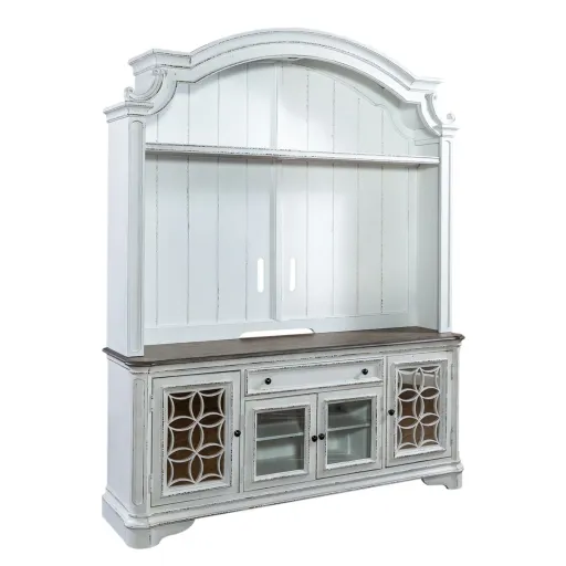 This large entertainment center will meet all your living room electronic storage needs. Highlighted by four glass doors, the console includes a long top shelf and drawer area for extended accommodation. Completed with rustic accents and an antique white finish, this well-crafted entertainment center presents traditional style for your old-fashioned living room space.