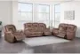 The Alaya Brown Living Room Set offers a perfect blend of casual style and ultimate comfort. Upholstered in a soft, saddle brown polyester fabric, this set mimics the luxurious look of leather without the high cost. The set includes a power sofa, power console loveseat, and a glider recliner, all designed to provide a relaxing experience.