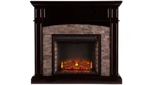 The Emery convertible media fireplace serves as the ideal warm and enchanting entertainment console, beneath a wall mounted TV. Classical carving and a deep ebony finish conceal the flip down media shelf.