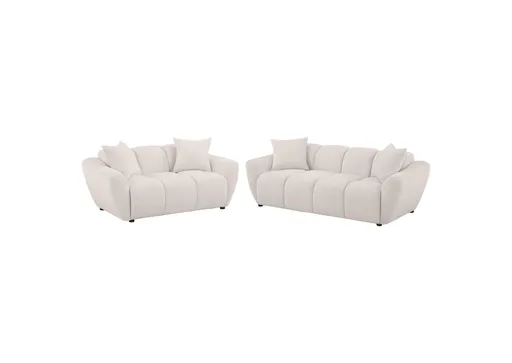 Plush, sculptural, and undeniably bold, this modern sofa set showcases chunky silhouettes wrapped in soft greige chenille. Wide splayed arms frame deep, channel-tufted contours, while attached waterfall seats are built with pocket coil construction for long-lasting support. Textured upholstery adds dimension to the grid-like shaping, offering a refined yet cozy aesthetic. Complete with matching knife-edge accent pillows, this sofa set blends form and function with contemporary ease.