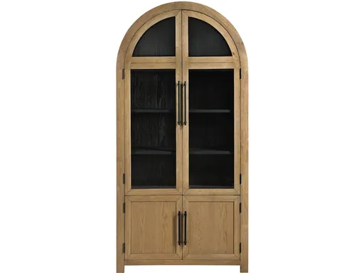 The Stowe Curio Cabinet, in weathered wheat with a black interior, adds elegance to any room. Its domed top and upper dual glass doors create a stunning display for china, collectibles, or décor, while lower dual doors provide hidden storage. The rich weathered sand finish serves as a striking modern accent, whether paired with the Stowe collection or used alone. Graceful and versatile, this piece blends beauty with convenience, making it a perfect addition to any space.
