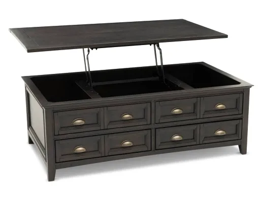 The Cassian Lift Top Coffee Table is a modern coffee table for your living room! In a graphite finish with pewter hardware, this lift-top table is stylish!