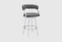 The Bernini 26" Counter Height Swivel Bar Stool combines modern design with mid-century flair, featuring a sleek gray faux leather seat and brushed stainless steel frame. Its 360-degree swivel function ensures maximum mobility and comfort, making it a stylish and functional addition to any kitchen or dining area.