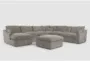 Introducing the Kennedy Mocha 7 Piece Power Reclining Modular Sectional with Left Arm Facing Power Chaise & Ottoman. This modern sectional is designed to provide ultimate comfort and style to your living space. The brown fabric upholstery complements its casual yet sophisticated look, making it a perfect addition to any home.