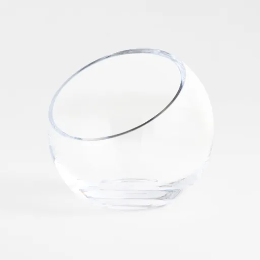Handmade glass sphere is cut at an angle and polished for a modern look and easy access to snacks, candy, candles or floating blossoms.