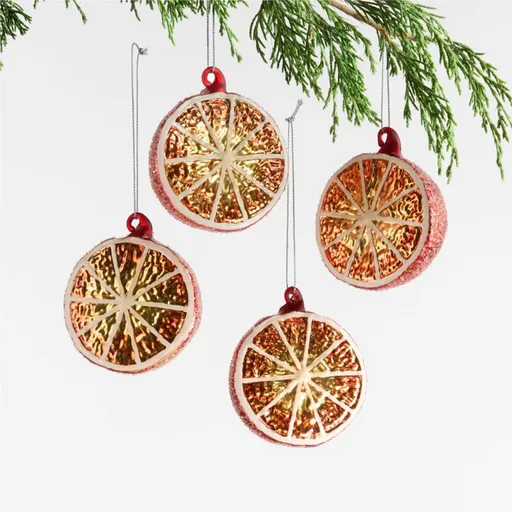 Fruit-shaped ornaments hint at the extravagant bounty of the Christmas feast, adorning the tree with delicious color and sparkle. Our orange halves are sugared with glitter on the textured rinds, while the cut sides shine with a metallic finish that hints at juiciness. Add our other fruit-shaped ornaments for a tree that celebrates seasonal delights.